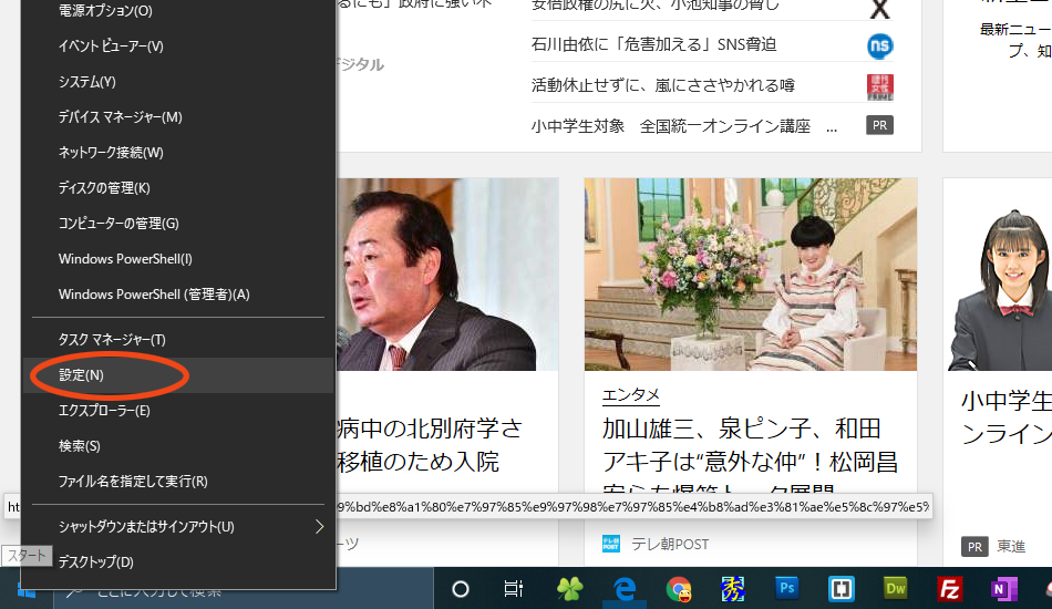 ①Windowsボタンを右クリックして、更に「設定」をクリックし「Windowsの設定」を開きます。(※Windowsボタンをクリックして歯車をクリックしても「Windowsの設定」が開きます)