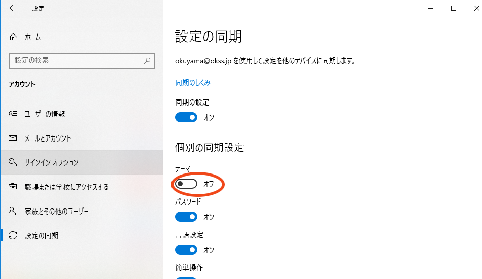 ④個別の同期設定の中にある「テーマ」をオフにすれば、テーマ及び壁紙は同期されなくなります。