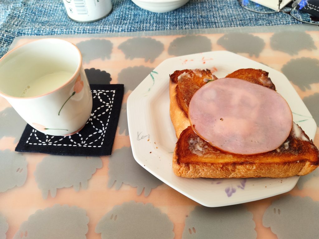4枚切り食パンにマーガリンではなくマヨネーズを薄く塗って、きゅうりのスライスを載せてその上にハムを1枚載せました。普段はマーガリン派なんですが、実はマヨネーズは少量なら太らないという事を以前聞きまして、それ以来ダイエット中はマヨネーズを塗るようになりました。飲み物は「明治ラブ」を70mlほど。