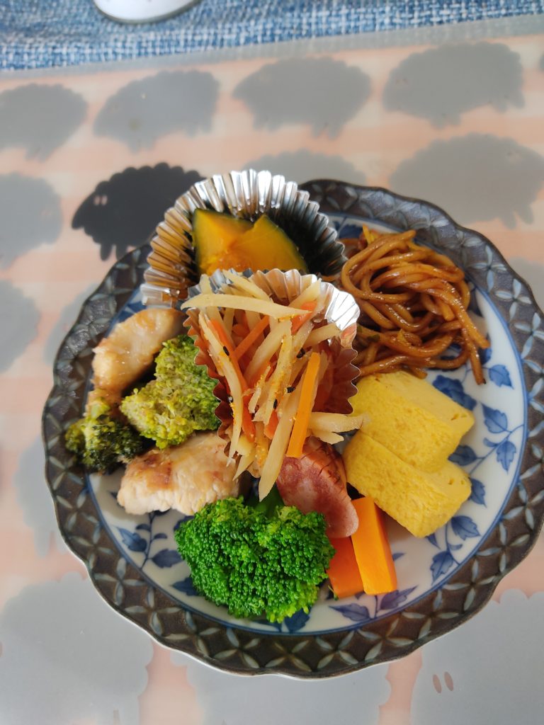 昼食は、朝嫁さんが弁当を作る際におかずを皿に盛りつけてくれているものを頂いてます。ブロッコリー、にんじんは週末に茹でておいて、少しずつ使います。キンピラごぼうやカボチャ煮も同じで、週末に作り置きしてタッパーにいれて冷蔵庫に保存しています。焼きそばはスーパーの冷凍食品、左端はブロッコリーと鶏むね肉を和風で味付けして炒めた昨晩のおかずの残り物です。