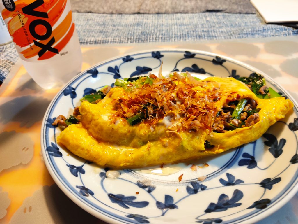 夕食は、スーパーで買ってきた小松菜と合挽ミンチを塩コショウで炒めて、卵2個の溶き卵で包んで作ったオムレツです。糖質を控えるため、マヨネーズ+しょうゆ+アサヒポン酢でソースを作って、仕上げに鰹節を半量ふりかけた「和風オムレツ」です。この和風オムレツは、結構食べた感があって、ダイエット中の食事としては定番メニューになりそうです。